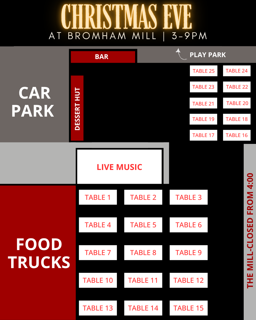 Join us on Wednesday 24th December, 3–9pm for a magical evening of live music, food trucks, our festive bar, and plenty of Christmas cheer!
